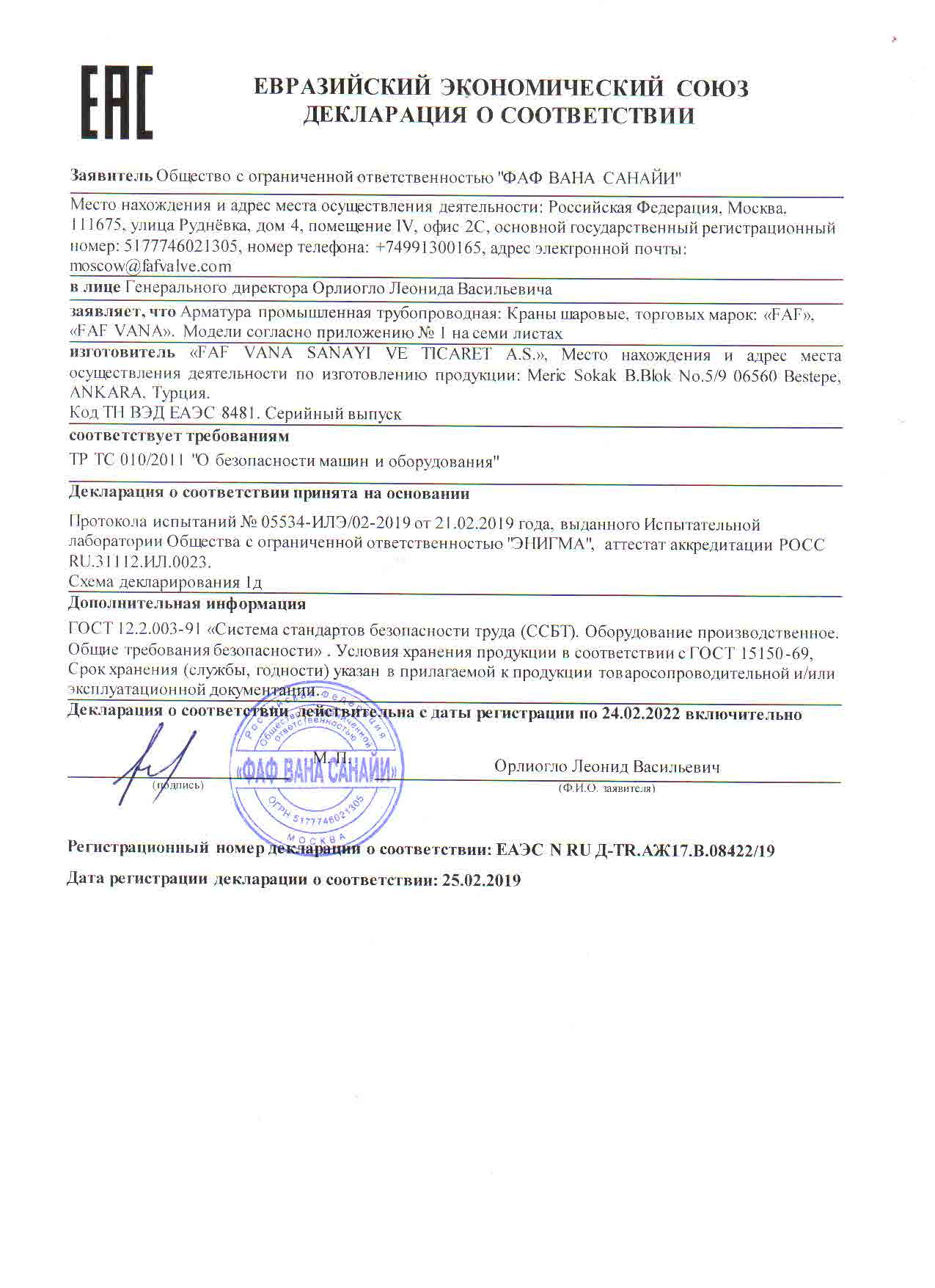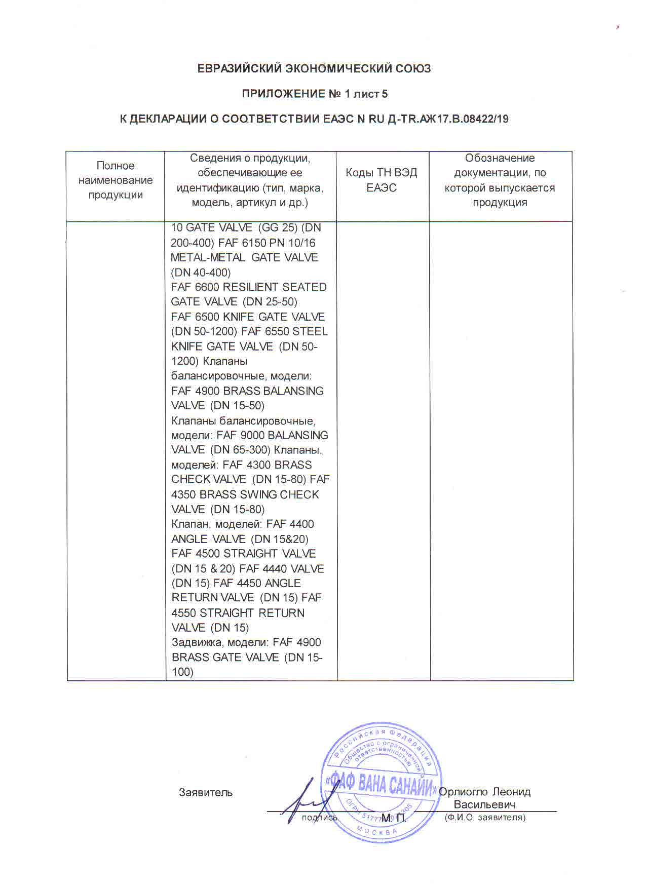 Сертификат ЕАС - Compañía de válvulas Faf